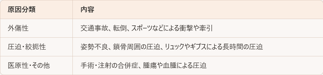 腕や手のしびれ、力が入らない、指が動かしづらい…そんな症状に悩まされていませんか?それは「腕神経叢(わんしんけいそう)」の損傷が原因かもしれません。この記事では、腕神経損傷の原因や症状、そして回復に向けたリハビリの進め方について、わかりやすく解説します。 腕神経叢とは?腕神経叢とは、首の脊髄(C5〜T1)から出た神経が束になって、肩から腕、手指へとつながっている神経ネットワークのこと。運動だけでなく、触覚や痛覚などの感覚にも深く関係しています。この神経が損傷すると、以下のような症状が現れます:・手や腕のしびれ・筋力低下・指が思うように動かない 腕神経損傷の主な原因腕神経が損傷する原因は、大きく3つに分けられます。