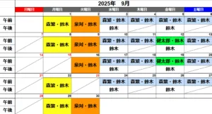 R7年9月の森整形外科 医師診療日は以下の日程で予定しております。 ※森繁医師が休みの場合、森健太郎医師が出勤となります。