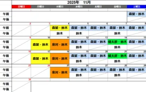 R7年11月の森整形外科 医師診療日は以下の日程で予定しております。 ※森繁医師が休みの場合、森健太郎医師が出勤となります。
