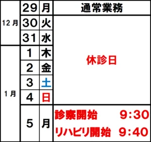 誠に勝手ながら、下記の期間を 年末年始の休診日 とさせていただきます。 〈休診期間〉 R7年12月30日(火)~ R8年1月4日(日) 〈診療開始日〉 R8年1月5日(月) 診療開始(9:30〜)/ リハビリ開始(9:4 […]