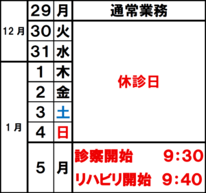 年末年始のお知らせ 2025年12月8日 最終更新日時 : 2025年12月5日 森整形スタッフ 誠に勝手ながら、下記の期間を 年末年始の休診日 とさせていただきます。〈休診期間〉R7年12月30日(火)~ R8年1月4日(日)〈診療開始日〉R8年1月5日(月)診療開始(9:30〜)/ リハビリ開始(9:40〜) 皆さまにはご不便をおかけいたしますが、 何卒ご理解の程よろしくお願い申し上げます。