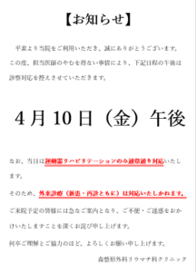 R8年4月の森整形外科 医師診療日 2026年4月6日 最終更新日時 : 2026年4月6日 森整形スタッフ R8年4月の森整形外科 医師診療日は以下の日程で予定しております。 ※森繁医師が休みの場合、森健太郎医師が出勤となります。