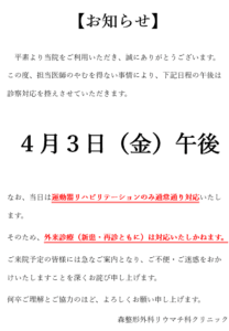 新院長就任のお知らせ 2026年3月27日 最終更新日時 : 2026年3月27日 森整形スタッフ新院長就任のお知らせいつも当院をご利用いただきありがとうございます。 このたび、令和8年4月1日より 森 繁 医師 が新たに院長に就任いたしました。 これまで同様、皆さまに安心してご来院いただける医療を提供してまいります。 今後ともご愛顧のほどお願い申し上げます。