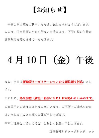 この度、担当医師のやむを得ない事情により、下記日程の午後は